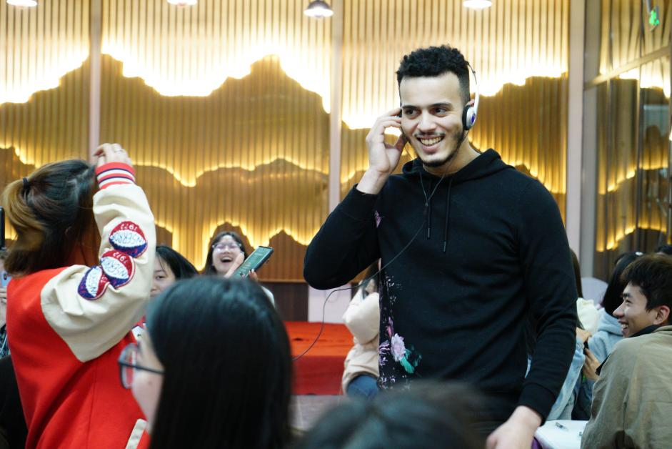 交流活動中場舉行了精彩有趣的猜歌游戲:主持人邀請外國小伙伴們依次上場佩戴耳機,哼出耳機中播放中文歌的旋律,而現場的其他小伙伴則根據他們哼出的旋律來猜歌名,猜對歌名的伙伴可獲得了神秘的盲盒禮物。現場熱鬧的氛圍被推到了高潮。