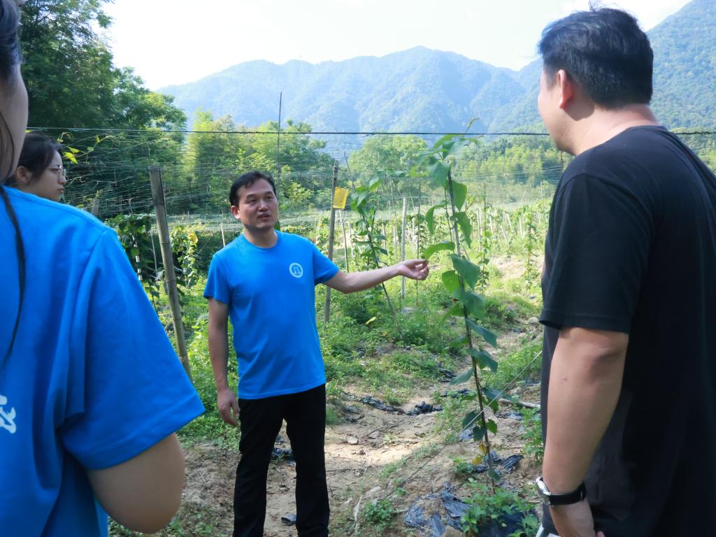 圖為:“潯夢楊洲”社會實踐隊與羅漢果老板在種植基地實地考察,了解羅漢果的生長、作用和銷售情況。