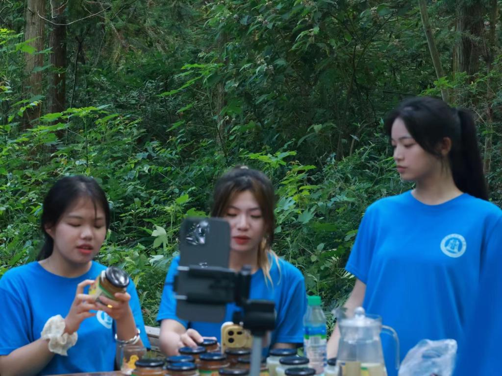 圖為:“潯夢楊洲”社會實踐隊隊員在山上養蜂基地介紹蜂蜜品種品質。