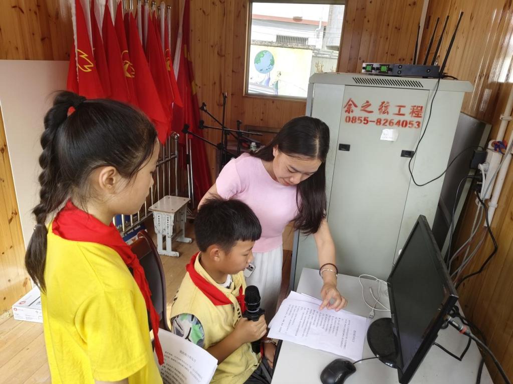 舟溪小學(xué)廣播站的播音員正在深情朗誦著詩歌《我的南方和北方》。吳興菊是學(xué)校廣播站的指導(dǎo)老師,看見我們來,介紹著這兩位五年級的孩子:“這是我們廣播站的王牌呢!”