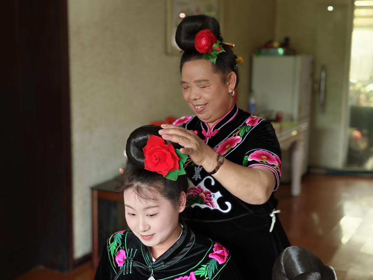 “這是我們苗族的傳統(tǒng),如果你從遠(yuǎn)方來,那么我一定要招待你到家里喝酒” 我們很好奇她的普通話為什么這么好,原來她曾經(jīng)當(dāng)過凱里周邊6個自然行政村的醫(yī)生。行醫(yī)的歲月里,她親歷著地區(qū)普通話推廣得越來越好。現(xiàn)在凱里鴨塘鎮(zhèn)大多數(shù)自然村都能無障礙交流了,“當(dāng)然了,我們講話的口音還是有點(diǎn)改不掉。說得不好,說得不好。”她爽朗地笑著。她還給我們團(tuán)隊的小姑娘盤起了苗族發(fā)髻,一遍遍梳著都是滿滿的祝愿。“真好啊,妹妹們,推廣了普通話讓你們來我家里做客啊。”