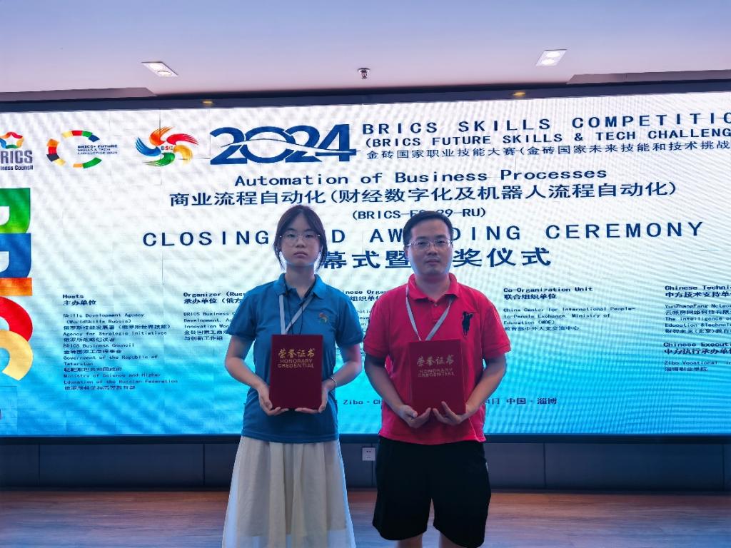 此次大賽由俄羅斯技能發(fā)展署(俄羅斯世界技能)、俄羅斯戰(zhàn)略倡議署、金磚國(guó)家工商理事會(huì)、韃靼斯坦共和國(guó)政府、俄羅斯科學(xué)和高等教育部主辦;金磚國(guó)家工商理事會(huì)(中方)技能發(fā)展工作組、“一帶一路”暨金磚國(guó)家技能發(fā)展國(guó)際聯(lián)盟、教育部中外人文交流中心作為中方協(xié)辦單位。經(jīng)過各省級(jí)區(qū)域選拔賽,大賽共有來自本科、高職院校的師生68名選手進(jìn)入國(guó)內(nèi)決賽。我校會(huì)計(jì)學(xué)院22級(jí)大數(shù)據(jù)與會(huì)計(jì)10班戴思怡同學(xué)在此次比賽中表現(xiàn)出色,以第四名的成績(jī)榮獲一等獎(jiǎng),席偉明榮獲“優(yōu)秀指導(dǎo)教師”稱號(hào)。