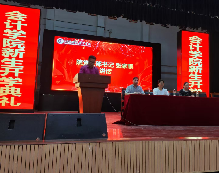 黨總支書記張家順代表會(huì)計(jì)學(xué)院全體師生向來自全國各地,將用智慧和勤奮點(diǎn)亮大學(xué)生活的新同學(xué)們表示熱烈的歡迎,并對(duì)新生們送上衷心的祝賀和祝愿,希望新生們盡快轉(zhuǎn)變角色,正確認(rèn)識(shí)大學(xué);培養(yǎng)家國情懷,做社會(huì)主義核心價(jià)值觀的堅(jiān)定信仰者、積極傳播者和踐行者;要以理想照亮前行的路,爭做有理想、敢擔(dān)當(dāng)、能吃苦、肯奮斗的新時(shí)代“四有”好青年。