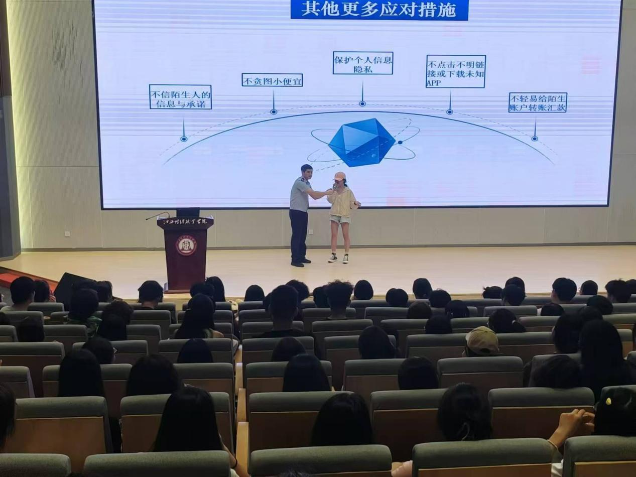 活動現(xiàn)場陳警官用通俗易懂的語言結(jié)合具體案例,采取以案講法、以案學(xué)法的方式,深入剖析大學(xué)生群體最容易受騙的詐騙類型和作案手法,向同學(xué)們傳授防范“秘籍”。用有獎問答的形式同學(xué)生們一起學(xué)習(xí)《反電詐法》《反有組織犯罪法》的法律法規(guī),讓同學(xué)們知法、守法。陳警官從多方面描述各類詐騙手段和防范技巧,為校園反詐知識“劃重點(diǎn)”;送上最強(qiáng)反詐“開學(xué)指南”,還積極引導(dǎo)師生們主動發(fā)揮宣傳輻射作用,鼓勵他們爭做“反詐”宣傳員,把學(xué)到的知識分享給家人和朋友,共同構(gòu)筑反詐“安全墻”。
