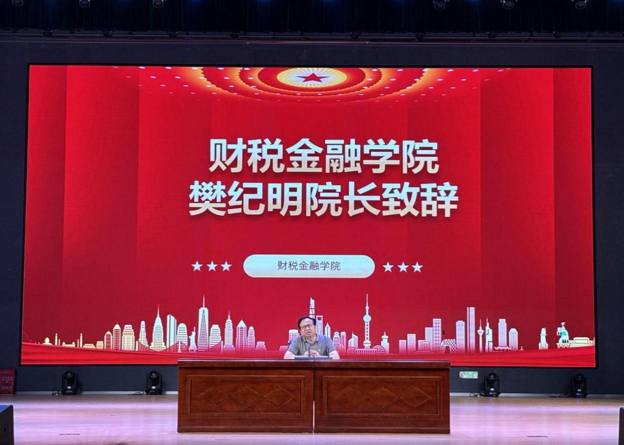本次開學典禮共分為五個環節,內容豐富,形式多樣。首先,財稅金融學院院長樊紀明致辭。樊院長從向書本學、向老師學、向優秀的同學學三個方面出發,對新生提出了殷切希望。他勉勵新生要制定明確規劃,設定遠大目標,不斷拓展自己的知識視野和認知深度,力求在大學期間實現自我超越和全面成長。