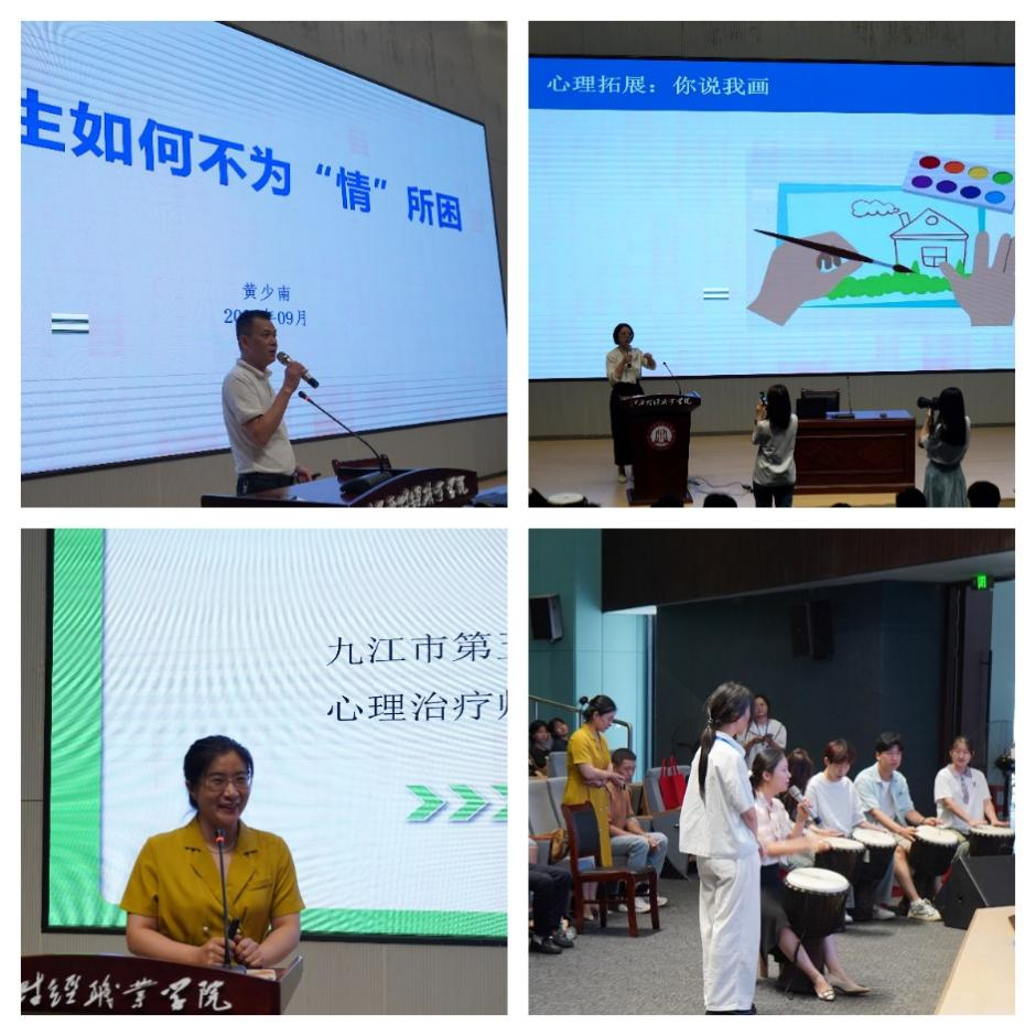 黃少南院長以《大學生如何不為“情”所困》為主題,以生活情景案例為開篇,為大一新生們詳細介紹情緒的產生、如何正確地認識情緒、學會情緒自我調節以及如何與人相處和諧,從“想法、行動、學習、心態”四個方面給出指導性建議。團隊成員鄭樸然以“你說我畫”的方式為新生們講解何謂積極有效的溝通、人際關系對個人的意義、如何利用愛的語言“觀察、感受、需要、請求”去建立良好和諧的人際關系。團隊成員張偉娟通過詼諧幽默的漫畫切入《認識“心理咨詢”》主題,讓新生們樹立了對“心理咨詢”的正確認識,同時展示了心理咨詢的多元化形式,涵蓋“個體咨詢”“團體輔導”“沙盤療法”“繪畫治療”“情緒宣泄”“正念冥想”及“音樂療法”等豐富手段。團隊成員陶晶通過現場教授同學們演奏非洲鼓引領新生們踏入了一場奇妙的心靈音樂之旅,體驗了音樂療法帶來的心靈撫慰與力量。在場學生們反響熱烈,積極參與互動,不僅掌握了情緒管理、人際溝通的技巧,還樹立了對心理咨詢的正確認識,為大學生活注入了滿滿的正能量與希望。