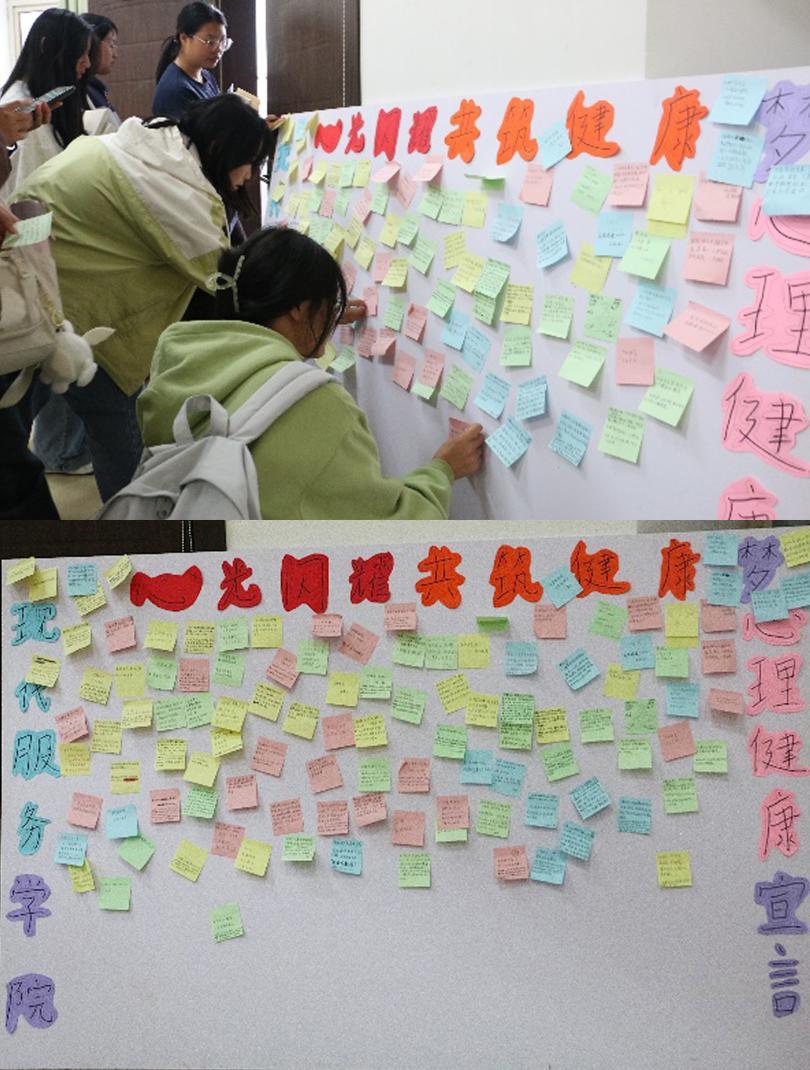 本次活動旨在提升大學生對于心理健康的認知,更為大家提供了一個交流與分享的平臺,共同探討如何在快節奏的生活中守護心靈綠洲。曾征不僅積極倡導自我心理健康的關注,還鼓勵大家將這份關懷延伸至他人,共同營造一個溫馨和諧的心理環境。講座中,曾征緊扣學生關注的熱點話題,運用視頻教學這一生動形式,打開了學生們的心扉。同學們紛紛主動分享自己在日常生活中遇到的積極經歷,歡聲笑語充盈著整個教室。借此良機,曾征引導同學們以筆為媒,記錄下自己的閃光點,用正面的語言為自己加油打氣,并在“心理健康宣言留言板”上鄭重寫下對未來心理健康生活的美好憧憬與承諾。