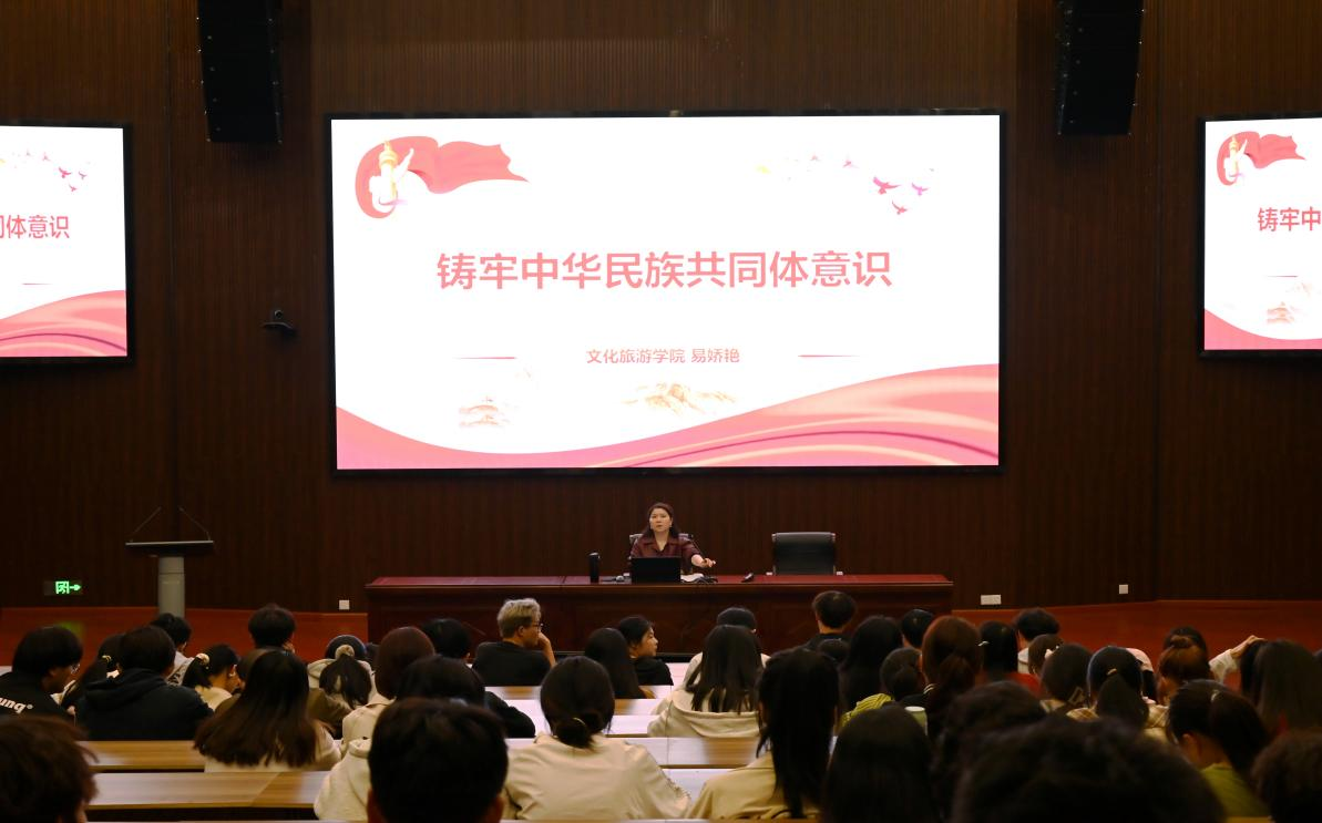 為深入學習領會習近平總書記關于加強和改進民族工作的重要思想,全面落實黨中央和學校統戰工作有關安排,進一步推動“鑄牢中華民族共同體意識”深入人心,切實增強學生的中華民族共同體意識,11月13日下午,文化旅游學院在八里湖新校區行政樓2號報告廳舉辦“鑄牢中華民族共同體意識”主題宣講會。此次宣講由文旅學院負責人易嬌艷擔任主講人,文化旅游學院各班學生代表參加,共同接受一場深刻的思想洗禮。