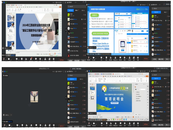 本次賽項說明會采用線上會議形式,由城鄉建設副院長呂亨龍主持。參加賽項說明會的人員有協辦單位井岡山大學吳老師、賽項專家組長、各參賽院校指導老師和參賽學生以及企業支持單位廣聯達、品茗、斯維爾三家企業技術代表。