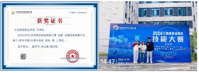 吳翠翠和蔡小萍指導的選手吳進雄、曹書敏、夏紫琴在建設工程數字化計量與計價賽項中獲得團體一等獎(第一名)晉級國賽;張麗雅和杜波指導的選手榮彩玲、胡錚、但寧鈺在裝配式建筑智能建造賽項中獲得團體二等獎;楊義剛和呂霽指導的選手謝安傳、占安勝、徐巖鈺、周昊在地理空間信息采集與處理賽項中獲得團體二等獎;郭發麗和呂亨龍指導的選手黃立志、鄒東建在建筑工程識圖賽項中獲得團體三等獎;郭發麗和莫璇指導的選手李晟榮、張慧琳在建筑工程識圖賽項中獲得團體三等獎;教師溫平平和學生米玉婷、鄢月凱在(師生同賽)建筑裝飾施工圖數字化施工賽項中獲得團體三等獎。