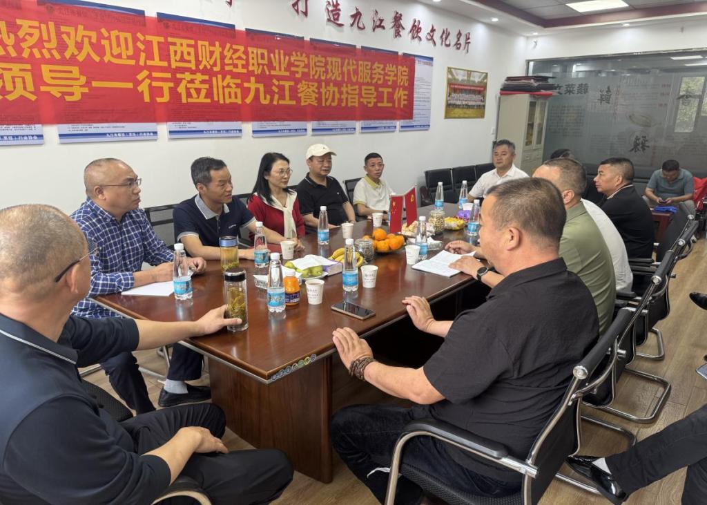 為進一步加強校企協同創新、人才培養模式優化、實習實訓基地拓展、共同謀劃校企合作發展新路徑,2025年4月28日下午,現代服務學院(本科部)黨總支書記高小蘭、副院長(主持工作)姜啟躍、烹飪專業教師(外聘)葉為國、學生科負責人劉玉兵一行,來到九江市餐飲(烹飪)行業協會開展訪企拓崗活動,考察交流及洽談烹飪專業學生的人才培養方案與未來畢業實習就業等合作,九江錦繡江南、盛世麒麟、魚頭泡飯、新光明等餐飲企業負責人參加了座談會。