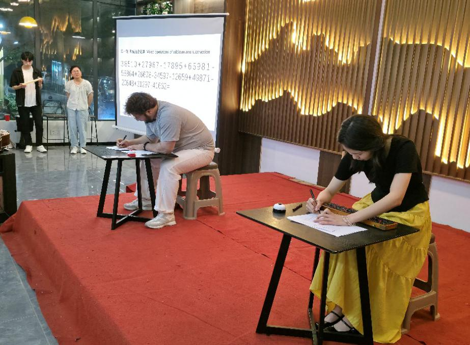 活動高潮出現在珠算直播PK環節。中方同學與外國友人展開激烈較量,外國友人使用筆算,中方同學則運用傳統算盤。比賽分三輪進行,前兩輪分別為加減法和乘除運算。憑借扎實的珠算功底,中方同學在這兩輪中均取得勝利,充分彰顯了傳統珠算技藝的獨特魅力與強大實用性。