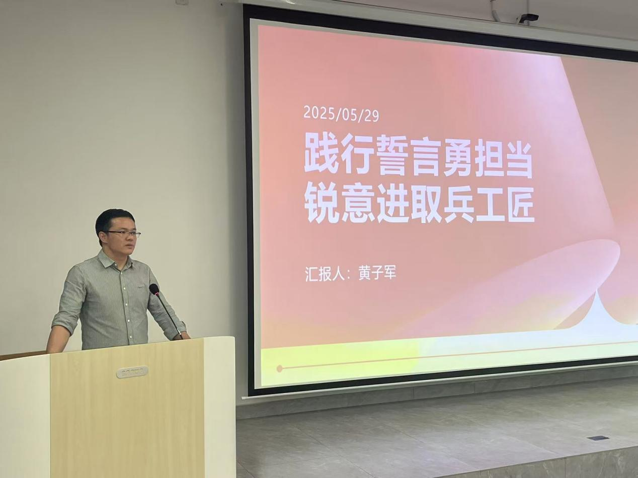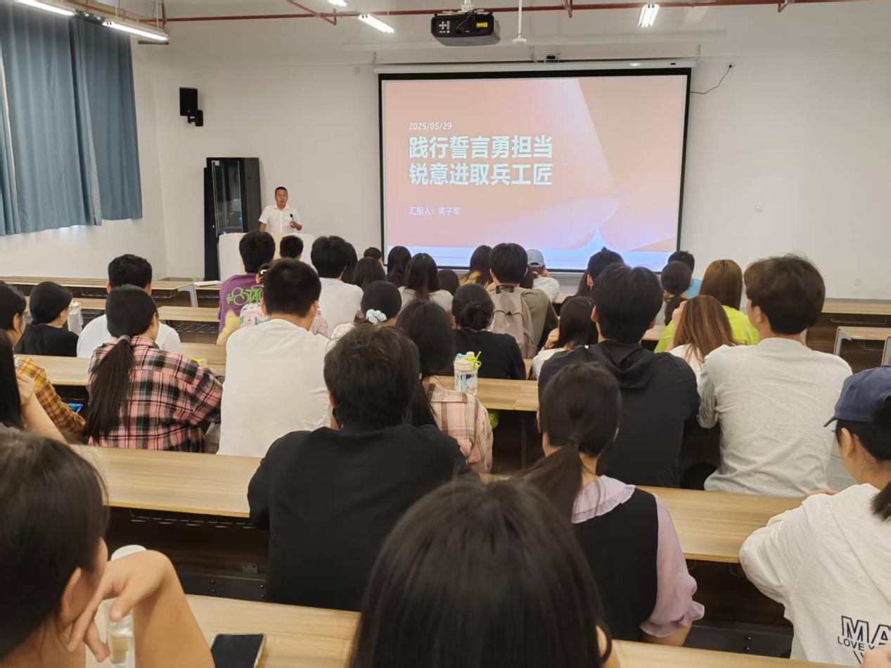 為學習先進事跡,弘揚“新時代贛鄱先鋒精神”,充分發揮先鋒模范示范引領作用,5月29日,工商管理學院邀請江西省2024年度“新時代贛鄱先鋒”榮譽獲得者黃子軍在洙泗學館117教室開展以“踐行誓言勇擔當,銳意進取兵工匠”為主題的宣講活動。學院23、24級各班班長、團支書、預備黨員、學生會干部現場聆聽先進事跡,汲取榜樣力量。活動由學院黨總支副書記趙新村主持。