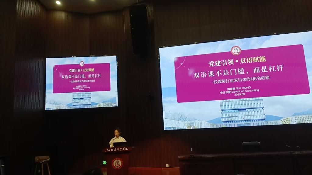為深入推進黨建與業務工作深度融合,以高質量黨建引領教學改革創新,9月25日,會計學院教工黨支部成功舉辦“黨建引領·雙語賦能”主題黨日教研活動。 本次活動特邀本院在雙語課程建設方面富有經驗的熊詩麗副教授擔任主講,教工黨支部全體黨員教師參加了活動。