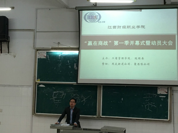 4月20日,工商管理學院在教學樓617教室召開了江西財經職業學院“贏在商戰”第一季系列活動開幕式暨動員大會。九江友信科技公司王超總經理、九江聚思味公司廖明強總經理、校團委青工書記葉睿老師、工商管理學院黨政班子、全體老師和來自工商管理學院、會計第一、二學院、經貿學院、本科部等院系的部分參賽同學參加了此次大會。