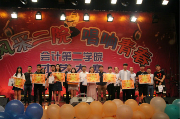會計第二學院領(lǐng)導(dǎo)和評委老師為獲獎選手頒獎。整場晚會始終沉浸在臺上臺下熱情互動氛圍之中。