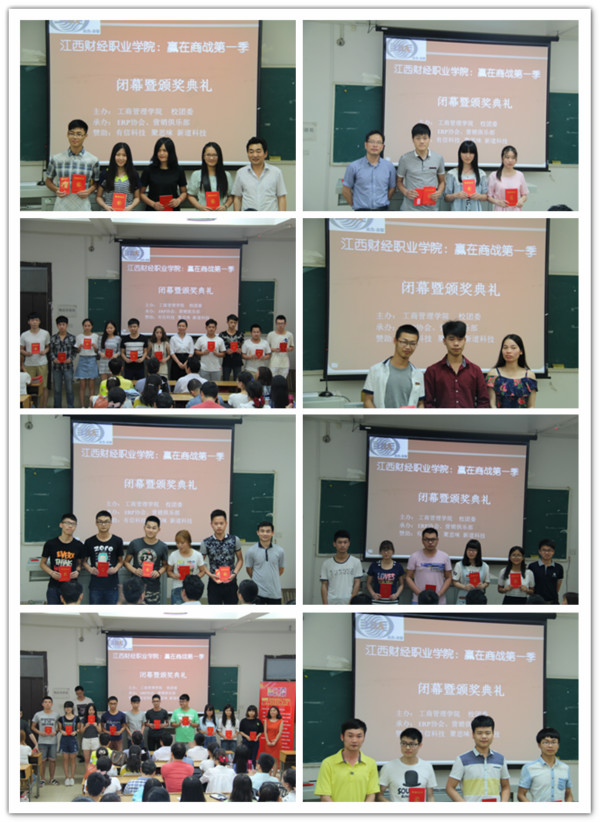 講座后隆重舉行了“贏在商戰”第一季閉幕式暨表彰大會。“贏在商戰”第一季企業經營管理沙盤賽項中,“友誼的小船團隊”(黃細鳳、王磊、鄒茜蕾、葛濤、徐嘉琪)、“阿甘團隊”(吳明活、馮青、段德亮、張凱、王彬議)分別獲得初級組與高級組一等獎;“憤怒的蝸牛團隊”(周洪、胡金、楊文麗、何雪娟)則摘得了營銷風采秀賽項的桂冠。出席大會的領導和嘉賓分別給各項賽事一等獎、二等獎、三等獎團隊頒發了證書和獎金。