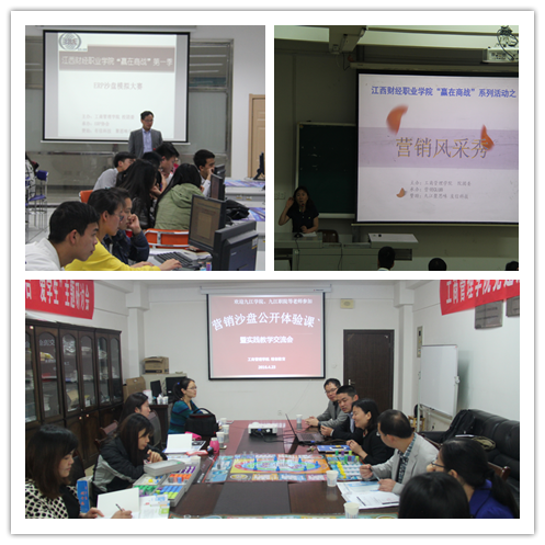 “贏在商戰”第一季系列活動由工商管理學院和校團委聯合主辦,ERP協會與市場營銷俱樂部具體承辦。活動主要由企業經營管理沙盤大賽、營銷風采秀等兩個專業技能賽項和交流.論壇等項目組成。在歷時兩個多月的活動期間,兩個專業技能賽項共吸引了來自工商管理學院、會計第一、二學院、經貿學院、本科部等院系500余名學生參加。交流.論壇項目舉辦了來自企業負責人、本院教師主講的兩場專題講座,成功組織了九江學院電商學院、九江職業大學經營學院等院校市場營銷專業教師參加的營銷模擬沙盤公開體驗課暨實踐教學交流會。