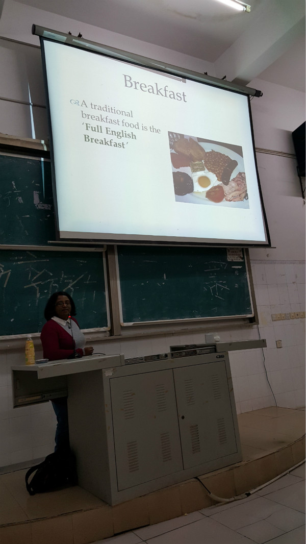 “大本鐘(Big Ben)、倫敦眼(London Eye)、威斯敏斯特宮(Palace of Westminster)、倫敦塔(Tower of London)……”,Taz Mudali首先通過這些著名的景點和熟悉的名字導入,結合自己的成長經歷,與同學們一起分享西方的文化內涵。在講座過程中,她通過問答的方式講解了西方飲食文化,和大家一起討論中西方飲食文化的區別;通過大量的圖片和視頻,給大家講解了西方音樂文化,甚至即興和同學們唱起了Queen樂隊的經典歌曲《We Will Rock You》,現場氣氛熱烈而又愉悅。