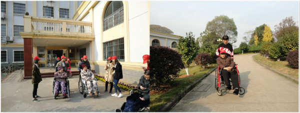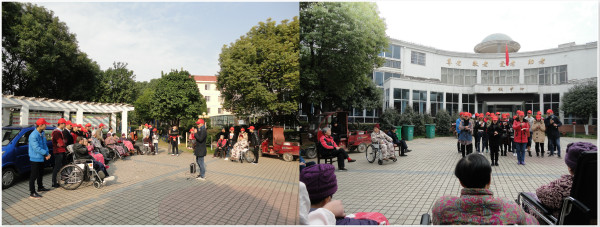 有的攙扶老人或推著輪椅帶老人到室外散步、曬太陽,并與老人們一起唱歌。