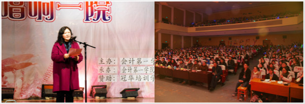 把酒當歌歌盛世,聞雞起舞舞新春。由會計第一學院舉辦的以“聞雞起舞,唱響一院”為主題的2017年師生元旦文藝晚會在我校英才交流中心隆重舉行,學校關工委常務副主任陳衛東書記、本院黨政領導、教師、班主任及各班學生代表等1000余人共同觀看了本場晚會。晚會由本院學生黃星、吳媚、黃鑫宇、熊雅熙、趙雨甜等同學主持。晚會現場座無虛席,處處洋溢著喜慶祥和的節日氣氛。