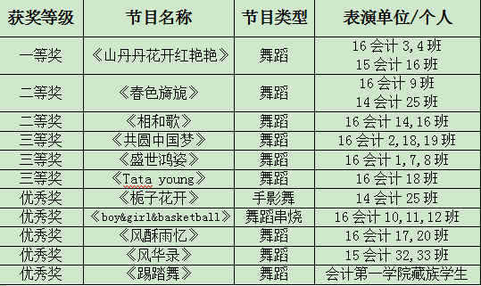 晚會在動感歡快、舞姿優美的舞蹈《共圓中國夢》中拉開帷幕;接下來由會計第一學院藏族學生帶來獨特風味的《踢踏舞》,為晚會增添了一絲絲輕松活躍的氣息;舞蹈《山丹丹花開紅艷艷》描述紅軍長征勝利抵達陜北時,正逢滿山的山丹丹花開的美麗情景,讓我們想起了老一輩革命先烈為了革命勝利,勇于奉獻誓死保衛家園的精神;舞蹈串燒《boy&girl&basketball》編排新穎,構思獨特,讓現場觀眾耳目一新;會計第一學院班主任王煥老師帶來的脫口秀《不想長大》,將劉德華、楊坤等人模仿的惟妙惟肖,全場觀眾都為他喝彩;古風典雅的群舞《風酥雨憶》清新高雅、超凡脫俗、美不勝收;接下來有財稅金融學院的魏旻書記等表演的《十送紅軍》,優美的舞姿與古典樂器融合,可謂蕩氣回腸;歌曲《親密愛人》美妙動聽,余音繞梁,綿延不絕;舞蹈《相和歌》完美地將鼓與舞蹈融合在一起;搞笑的小品《校園女主角》再一次讓觀眾為之鼓掌,齒牙春色;歡快的印度舞《Tata young》動感十足,展示了當代大學生的靚麗風采;晚會在手影舞《梔子花開》中圓滿落幕,表達了我院2014級應屆畢業生對學院的不舍之情和美好祝福。整場晚會精彩紛呈,高潮迭起,給現場觀眾奉獻了一場難忘的視聽盛宴。