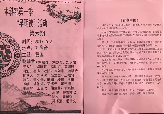 “一年之計在于春,一日之計在于晨”。為營造濃厚的學習氛圍,養成良好的朗讀習慣,牢記習近平總書記告訴青年朋友“非學無以廣才,非志無以成學”的人生格言。樹立為實現中華民族偉大復興中國夢而努力學習的意識,本科部開展了為期一個月的以“青春、知識、友誼、理想、運動、愛國”為主題的早誦讀活動。