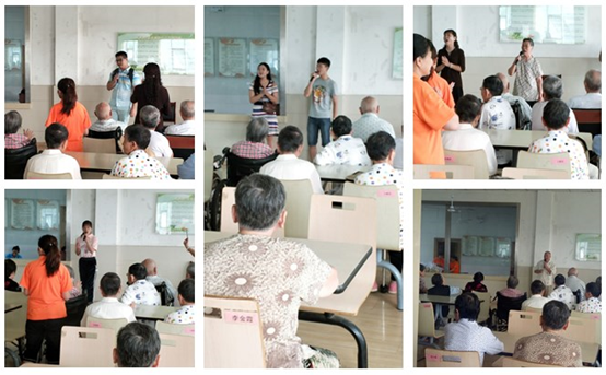 來到福利院后,同學們將老人們從房間攙扶到福利院的餐飲中心,將帶去的水果分發給老人們,并向老人們表演了精心準備的節目。在《北京的金山上》、《澎湖灣》、《映山紅》等老人們熟悉的歌曲和旋律的帶動下,一些老人也興味盎然地加入進來,帶來了京劇及手語表演。整個現場掌聲不斷、笑聲不斷,為平日寧靜的福利院增添了許多歡聲笑語。