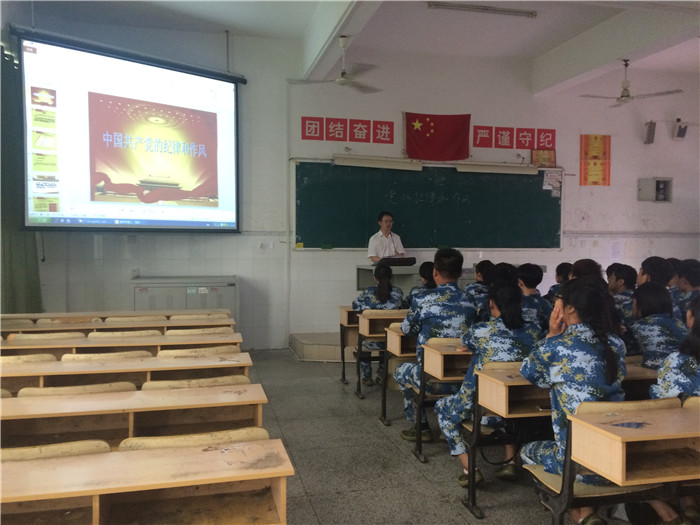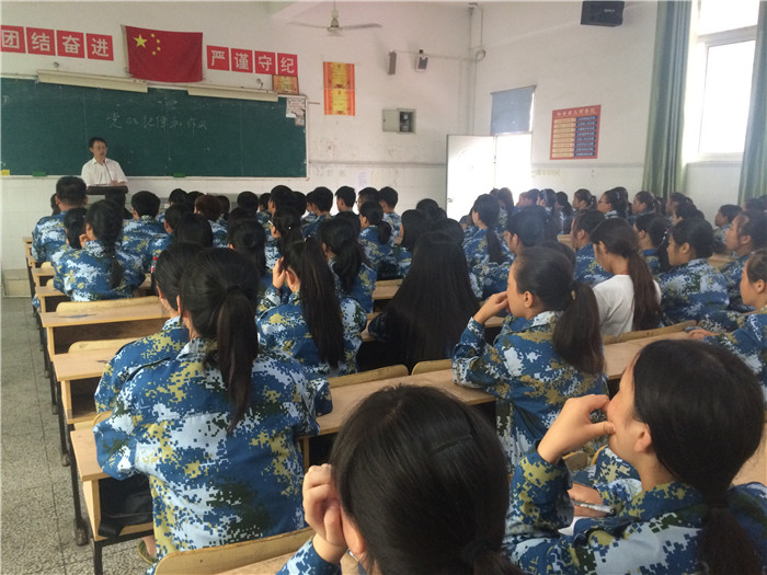 全體新生身著軍訓服,在教官的引領下,列隊井然有序進入教室,入座后,軍帽整齊擺放在課桌上,個個坐姿筆直,精神抖擻,聚精會神,認真聽課,展現(xiàn)出了軍訓的明顯成效和良好的精神風貌。