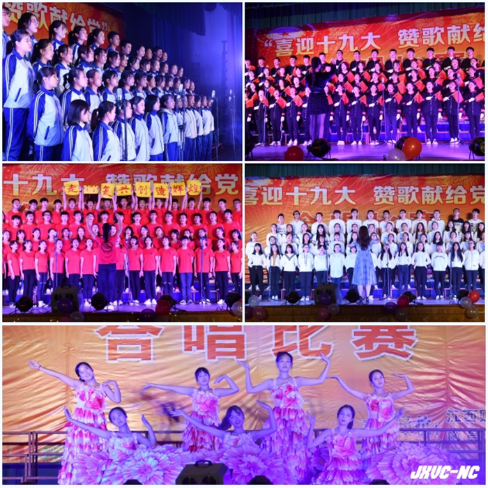比賽在2017級會計26班帶來的合唱歌曲《愛我中華》中拉開序幕。《紅星閃閃》、《當那一天來臨》、《游擊隊之歌》、《打靶歸來》等軍旅歌曲表達了同學們的豪情壯志, 《沒有共產黨就沒有新中國》、《團結就是力量》、《歌唱祖國》、《走向復興》等歌曲唱出了同學們對黨、對祖國的滿腔熱愛,充滿正能量的歌聲響徹校園。