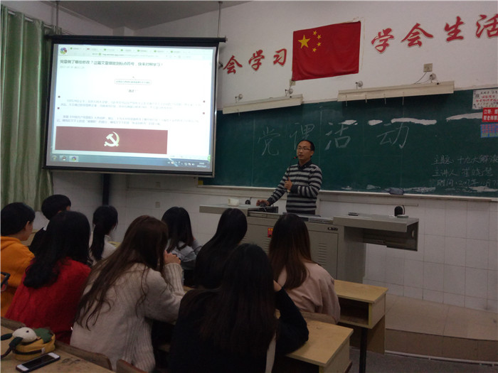 2017年11月7日晚上7點,經貿旅游學院學生黨支部書記崔曉慧在教學樓611舉行了有關十九大解讀教育系列黨課活動。全院入黨積極分子、預備黨員60余人參加了學習。