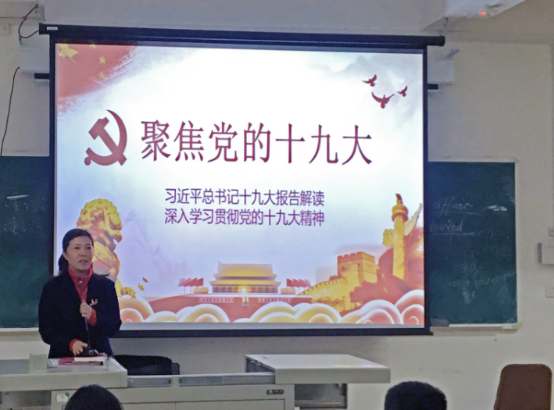 胡紅霞從十九大簡介及重要意義、十八屆一中全會到七中全會重點回顧、習(xí)近平總書記十九大報告內(nèi)容精解、做合格黨員不忘初心永遠跟黨走四個方面向?qū)W生全面介紹了十九大會議精神,重點從中國共產(chǎn)黨的初心和使命、新時代中國特色社會主義思想、新時代中國特色社會主義發(fā)展戰(zhàn)略安排、新時代堅持和發(fā)展中國特色社會主義的基本方略等方面對十九大報告的內(nèi)容進行了詳細解讀。