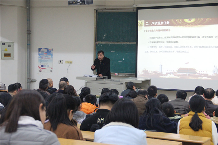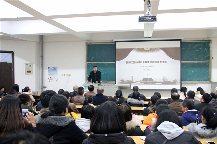 黨總支書記譚國云作了題為《新時代黨的建設總要求和八項重點任務》的專題學習講座。講座圍繞學習宣傳貫徹十九大精神政治任務,就如何理解與實現新時代黨的建設總要求,堅持和加強黨的全面領導,堅持黨要管黨、全面從嚴治黨,不斷提高黨的執政能力和領導水平等方面內容進行了系統的闡述,逐層講解了黨的建設的主題、主線、統領、根基、著力點、黨的建設六大方面和目標等七個方面內容,詳細講解了八項重點任務,著重強調把黨的政治建設擺在首位,用習近平新時代中國特色社會主義思想武裝全黨。實現偉大夢想,必須推進偉大斗爭,必須建設偉大工程,必須推進偉大事業,其中起決定作用的是黨的建設新的偉大工程。