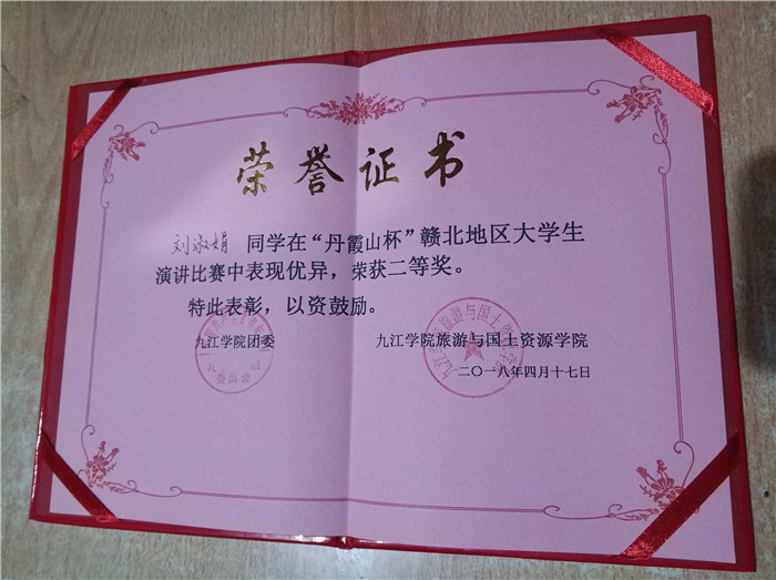 4月17日,在九江學(xué)院旅游與國(guó)土資源學(xué)院競(jìng)知樓舉辦的“丹霞山杯”贛北地區(qū)大學(xué)生演講大賽決賽中,我校經(jīng)濟(jì)貿(mào)易學(xué)院16酒店管理班劉淑娟以優(yōu)異的表現(xiàn)榮獲二等獎(jiǎng)。