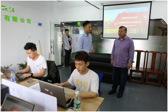 周執平一行在頤高集團有限公司九江區域運營總監劉吉喆陪同下,先后參觀了創業咖啡館、智能體驗館、無人超市、微巢學院等板塊,詳細了解了創業中心的入駐企業情況及創業服務、項目孵化等運營管理情況,并親身體驗了九江市第一家無人超市的購物流程。周執平處長還來到了江西威特科技有限公司,了解工商管理學院市場營銷專業學生開展電話營銷實訓的情況。