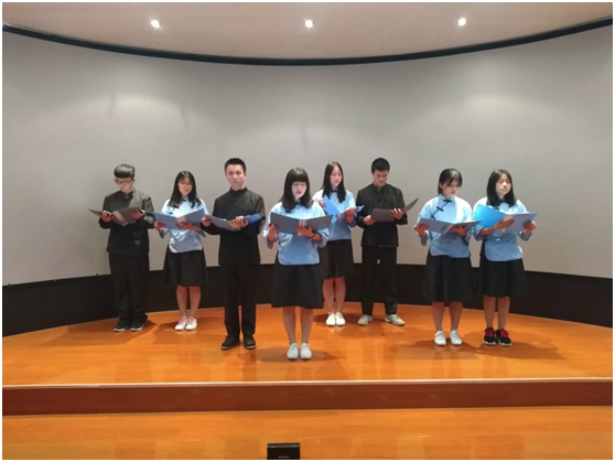 在17級工商企業管理2班馮甲樂同學演唱的歌曲《祖國慈祥的母親》中,比賽正式拉開帷幕。各支隊伍靈活采取多樣的朗誦形式,時而個人獨誦,時而兩人對誦,時而集體吟誦,并在或深情或激昂的音樂伴奏下,穿插了豐富多彩的陣型及形體表演,充分展現了詩歌朗誦的藝術感染力和舞臺表現力。各支隊伍的朗誦詩文更是精挑細選,充分潤飾,或歌頌仁人志士的英偉事跡,以青春的名義向榜樣致敬,或抒發有為青年的鴻鵠之志,以青春的力量吹響前進號角。參賽同學以飽滿的熱情、生動的語言、得體的舉止贏得了現場觀眾的陣陣掌聲。此外,在比賽間隙,林力、康港明兩位同學共同演唱了歌曲《白羊》、《紙短情長》,蘭夏鵬同學帶來了爵士舞表演。他們的表演不僅緩解了緊張激烈的比賽氣氛,也給比賽增添了別樣的色彩。