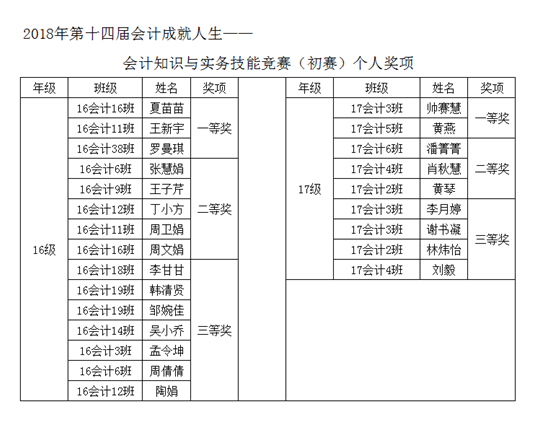 會計知識與實務(wù)技能競賽既是一場考核同學(xué)們個人綜合素質(zhì)的大賽,也是一場決定參賽班級能否晉級總決賽的重要賽事。各班高度重視,認(rèn)真組織,選派精英選手參賽。競賽通過模擬企業(yè)發(fā)生的常規(guī)經(jīng)濟業(yè)務(wù),全面、深入地考核了同學(xué)們對會計理論知識與實務(wù)操作相結(jié)合的綜合能力。比賽中,同學(xué)們沉著冷靜,審慎思考,仔細(xì)作答,充分發(fā)揮了個人的專業(yè)技能水平,展現(xiàn)了我院學(xué)生良好的專業(yè)知識素養(yǎng)和扎實的實務(wù)操作能力。經(jīng)過90分鐘的激烈比拼, 16會計11班、17會計3班等12支班級代表隊最終脫穎而出,獲得了參加此次總決賽的入場券;16會計16班夏苗苗、17會計3班帥蕾慧等24名同學(xué)獲得個人單項獎。