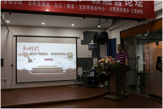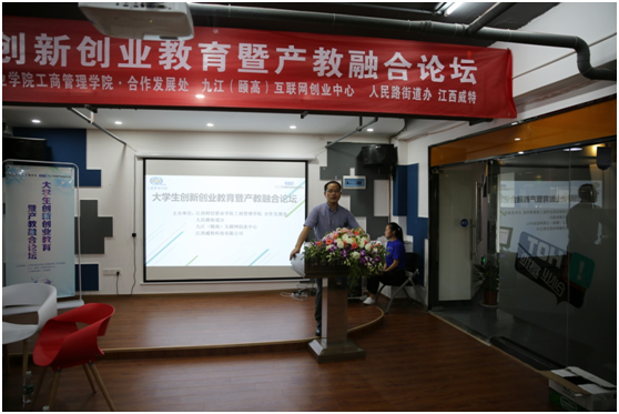 為進一步深化“雙創”教育、推進產教融合,工商管理學院、合作發展處聯合人民路街道辦、九江(頤高)互聯網創業中心、江西威特科技有限公司于6月14日共同舉辦了首屆大學生創新創業教育暨產教融合論壇。出席論壇的領導和嘉賓有校教務處處長程文忠教授、合作發展處處長周執平教授、人民路街道辦副主任李俊斌、九江(頤高)互聯網創業中心運營總監劉吉喆、江西威特科技有限公司總經理王超、九江展新汽車貿易有限公司總經理周晟及工商管理學院黨政班子。學院部分師生及九江互聯網創業中心的部分企業代表共計80余人參加了論壇。論壇由工商管理學院唐朝莉副教授主持。