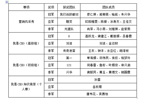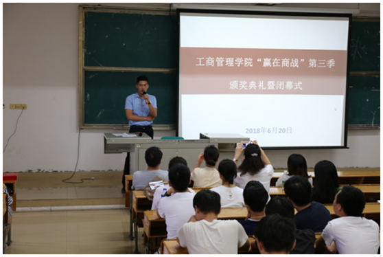 6月20日,工商管理學院在綜合樓階梯教室五召開了“贏在商戰”第三季頒獎典禮暨閉幕式。出席活動的領導和嘉賓有工商管理學院黨政班子、九江升陽計算機系統有限公司行業主管袁金榮、江西威特科技有限公司經理陳超、江西龍騰生物科技有限公司行政總監胡勵銘及人力資源經理肖孝萍。工商管理學院全體教師及200余名學生參加了活動。