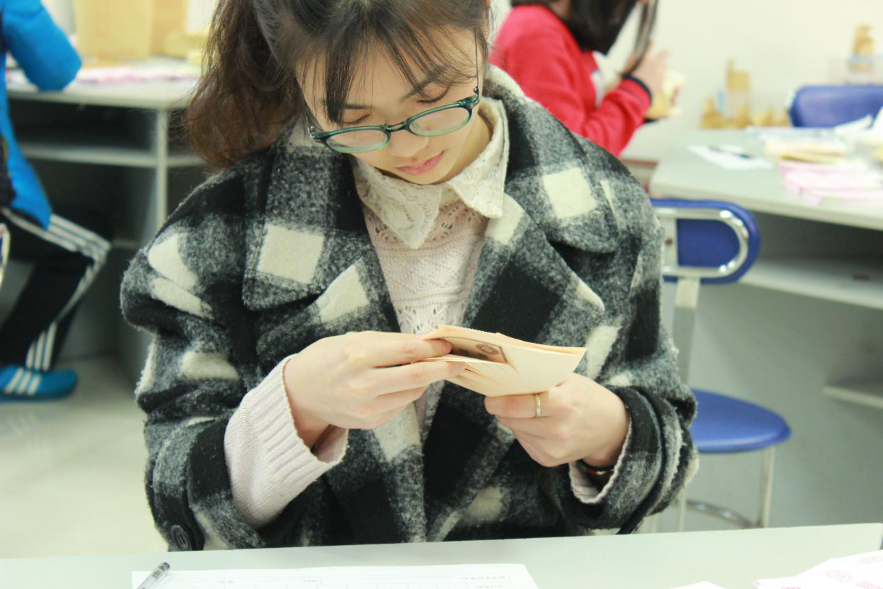比賽采用全省會計技能大賽的規則,要求參賽選手在5分鐘時間內依次完成對100、50、20、10元四種不同面值且不同數量的十把練功券的清點,全面考核同學們點鈔的速度與準確性。