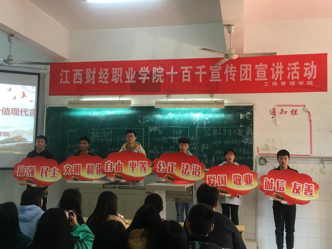 根據學校廣泛開展“十百千宣傳團”校園宣講活動的要求,為深入開展社會主義核心價值觀教育活動,工商管理學院于12月2日在校新時代文明實踐中心開展教育活動,活動邀請工商管理學院黨總支書記、我校新時代文明實踐中心宣講員胡紅霞教授主講《踐行社會主義核心價值觀》,工商管理學院19級全體學生開展“我為社會主義核心價值觀代言”活動。