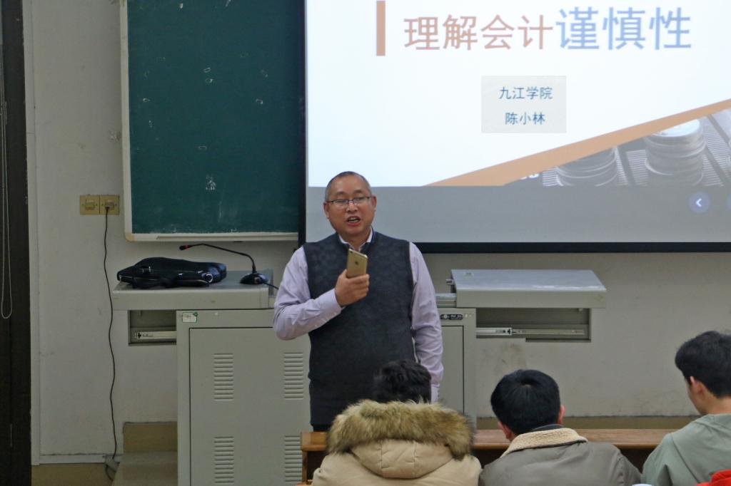2019年12月19日晚6:50,九江學(xué)院副校長陳小林教授應(yīng)邀給我校18級(jí)本科部學(xué)生在綜合階梯教室一,作《理解會(huì)計(jì)謹(jǐn)慎性》講座,講座由本科部負(fù)責(zé)人梁瑞紅教授主持。