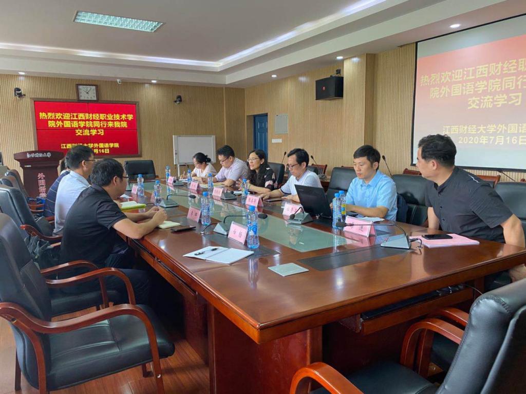 7月16日,外國語學(xué)院負(fù)責(zé)人帶領(lǐng)學(xué)院黨政辦公室主任、各教研室主任一行五人前往江西財經(jīng)大學(xué)外國語學(xué)院進(jìn)行學(xué)習(xí)交流。江西財經(jīng)大學(xué)外國語學(xué)院院長張曦鳳教授、副院長張善軍教授、商務(wù)英語系主任肖銳博士、副主任王力媛博士以及大學(xué)英語一部主任杜景平博士、實訓(xùn)中心主任常進(jìn)老師給予了熱情接待與交流。
