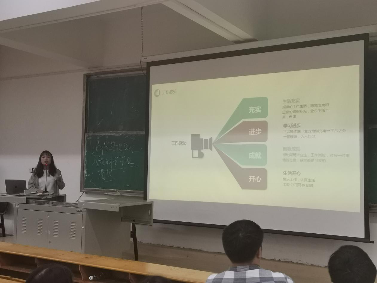 下午4點半,虞雨芳董事長一行為我院商務英語專業300余名學生舉辦了專題講座,從宏觀上分析我國的經濟形勢以及國內企業的發展趨勢,跨境電商行業和語言類人才的發展前景,鼓勵同學們抓住新時代所賦予的機遇,積極參與實踐學習,在校期間為就業做好充分準備。我校優秀校友15級商務英語專業畢業生姚木蘭從“充實、進步、成就、開心”四個方面分享她的職業成長過程,告訴同學們要堅定專業自信,積極參與社會實踐,找準自己的定位,體驗課外生活,給學弟學妹們熱情的鼓勵。