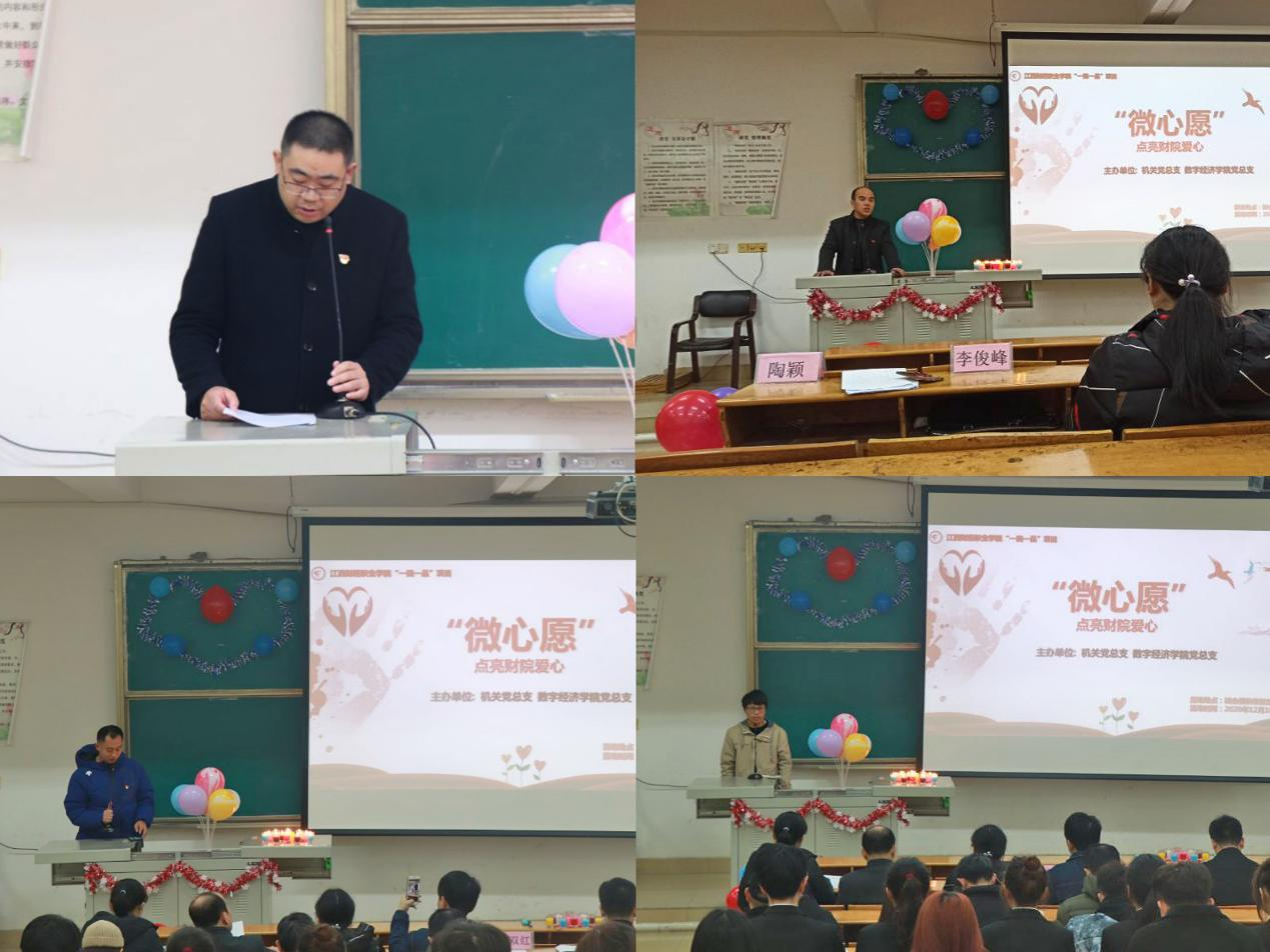 12月10日下午,由機關(guān)黨總支、數(shù)字經(jīng)濟學(xué)院黨總支共同組織的黨建“一院一品”項目:“微心愿”點亮財院愛心燭光捐贈儀式活動在綜合樓階梯教室六舉行。活動由機關(guān)黨總支書記主持,黨校、數(shù)字經(jīng)濟學(xué)院黨總支、機關(guān)黨總支黨員代表,學(xué)院愛心社成員和36名受助學(xué)生參加了此次活動。