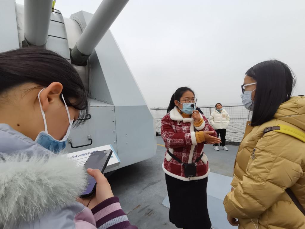 “九江艦”裝有5座50管火箭炮,口徑122毫米,一次齊射可發(fā)射250枚火箭彈,火力猛、密度大。艦上設(shè)有專門的火控系統(tǒng),可自動回轉(zhuǎn)發(fā)射,并帶有穩(wěn)定器,可以在較低的海況下對敵岸上目標(biāo)實施火力打擊,打擊精確高。”在講解員細(xì)致的講解下,同學(xué)們來到了艦外的甲板上,了解“九江艦”的武力裝備,感受中國海軍的力量,心生中國人的自豪感!