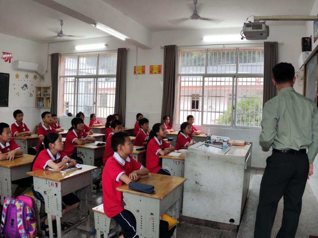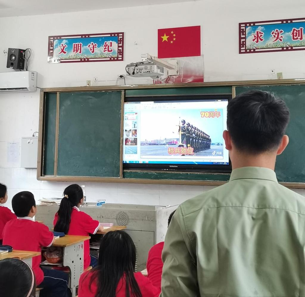 圖為羅少炫給學生們播放建國70周年閱兵式。中國青年網通訊員 龔爾潔 攝