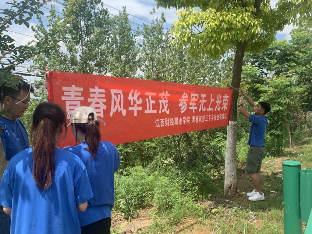 圖為隊員們在村民服務中心拉橫幅。中國青年網通訊員 龔爾潔 攝