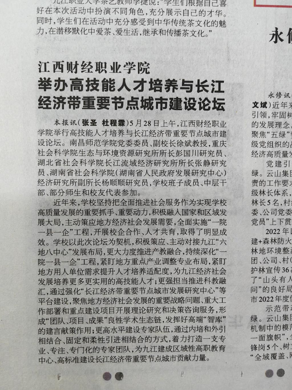 九江日報數字報-舉辦高技能人才培養與長江經濟帶重要節點城市建設論壇 http://jjrb.jjxw.cn/html/2023-05/30/content_85763_16160554.htm