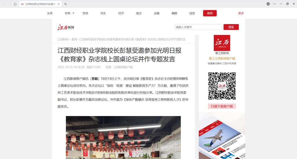 (江西新聞、江西文明網(wǎng)報(bào)道)江西財(cái)經(jīng)職業(yè)學(xué)院校長(zhǎng)彭慧受邀參加光明日?qǐng)?bào)《教育家》雜志線上圓桌論壇并作專(zhuān)題發(fā)言